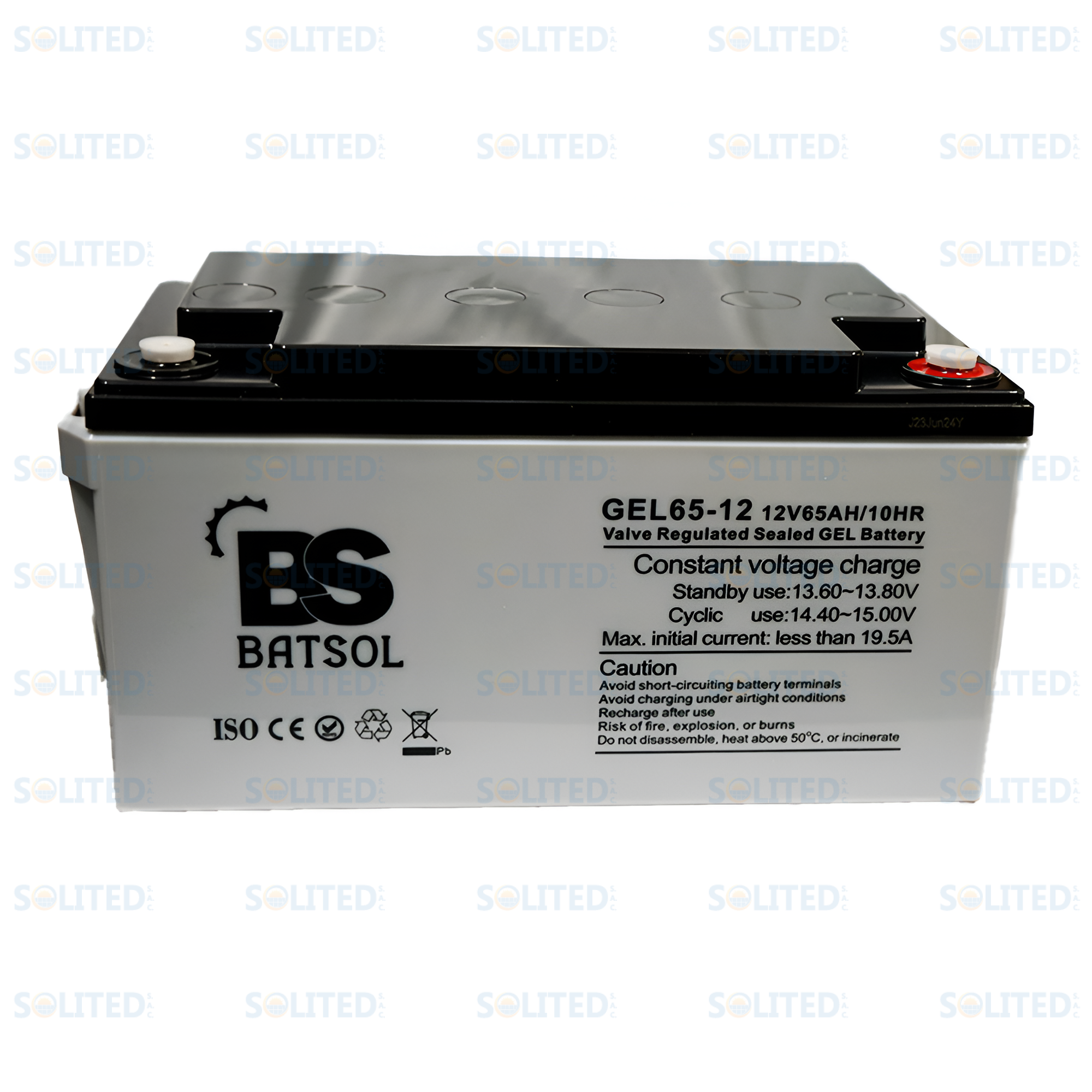 La batería Batsol 12V 65Ah es un modelo de ciclo profundo con tecnología AGM diseñada para un uso eficiente en diversas aplicaciones. Con una tensión nominal de 12V y una capacidad nominal de 65Ah a una tasa de 10 horas, esta batería contiene seis celdas y se destaca por su diseño compacto, con dimensiones de 350 mm de largo, 166 mm de ancho y 178 mm de alto, y un peso aproximado de 19,10 kg.